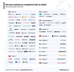 According to dealroom.co (see their overview below), the first half of 2025 saw 84 unicorns with a market capitalisation of over USD 1 billion, including 52 or 62% created in the US with 23% in Europe and 15% in the rest of the world.